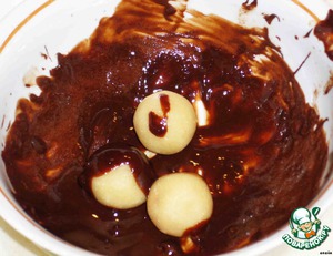 Я взяла черный шоколад и сливочное масло, растопила на водяной бане и покрыла им конфеты. Убрала все в холодильник на время.