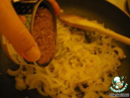 В сковороду с луком добавляем размятые вилкой рыбные консервы вместе с жидкостью. (У меня тунец, очень вкусно так же с лососем, горбушей). Перемешать и готовить около 3 минут.
