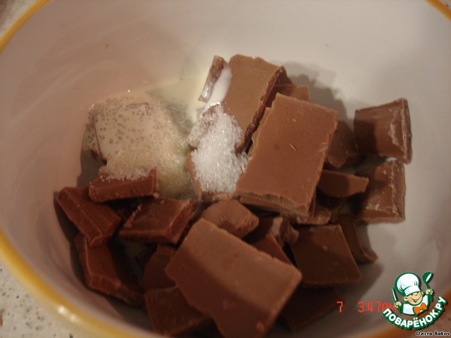 Шоколад поломать, добавить 50 г сливок, 1 ст. л. сахара, разогреть в микроволновке 1 мин, хорошо перемешать