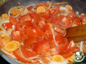 • Лук нарезала полукольцами, морковь кольцами - очень тонко нарезала, сладкий перчик тонкими полососчками, помидоры помельче. Лук обжарила на растительном масле, добавила морковь. В последнюю очередь помидоры.
