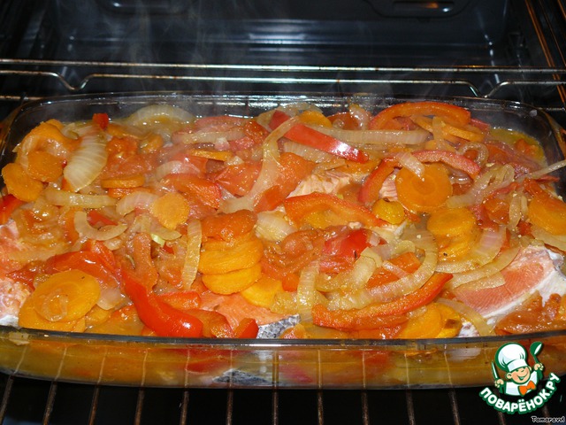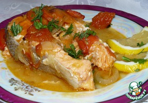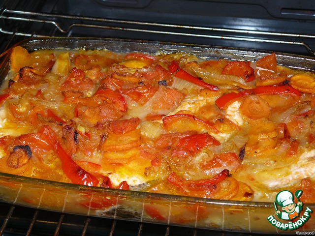 • Получившимся соусом заливаем рыбку. Если соус получился слишком густой, можно добавить немного рыбного бульона. И ставим в духовку минут 30.