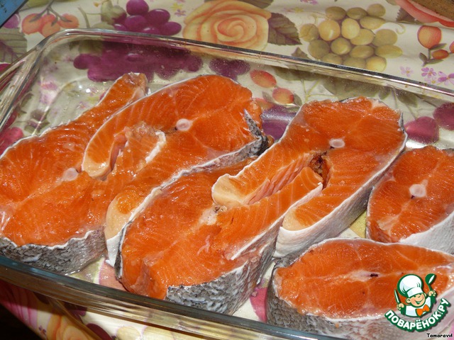 • Рыбку разрезаем на порционные куски и укладываем их в жаростойкую форму.