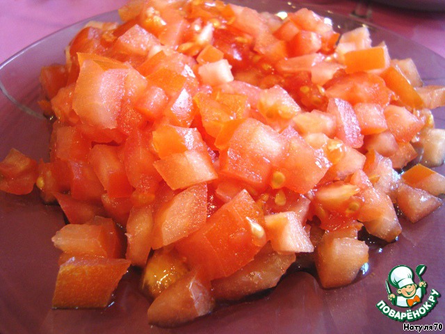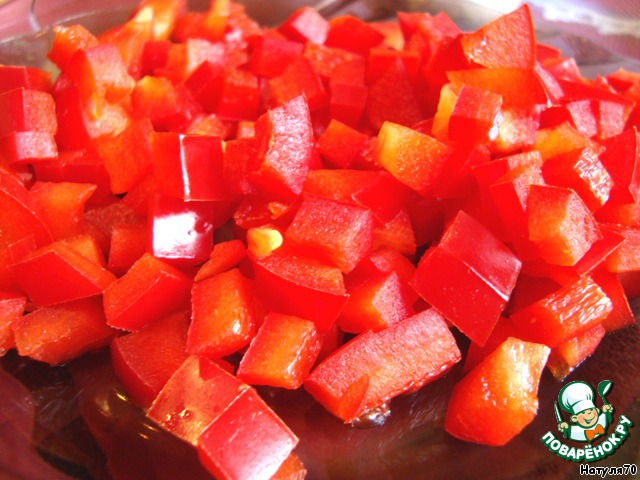Нарезать помидоры, перец и рыбку маленькими, одинаковыми кусочками.