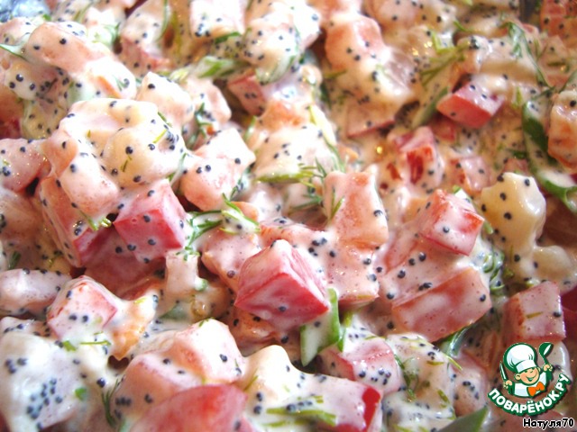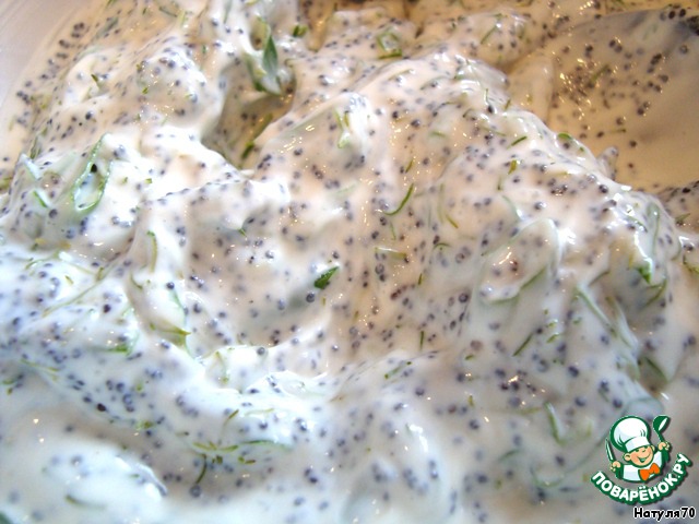 Для соуса смешать сметану, майонез, лук, укроп, измельченный чеснок и подсушенный на сковороде мак. Поперчить и посолить по вкусу.
