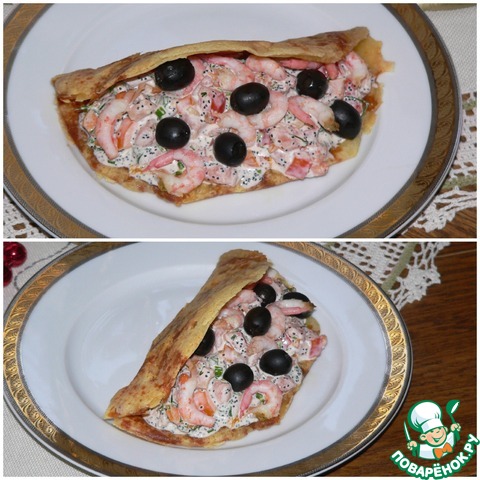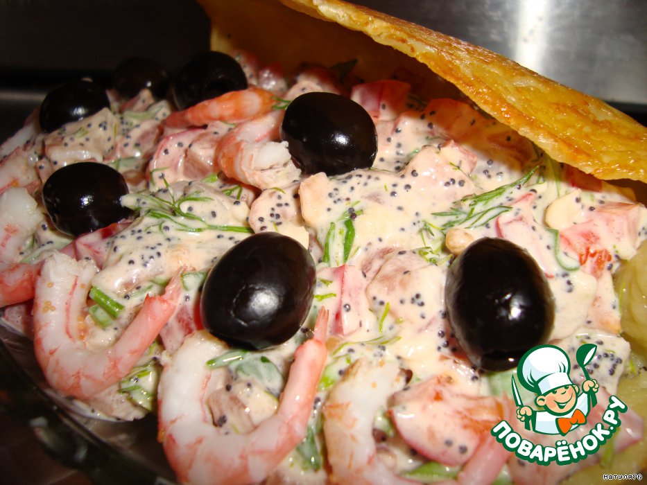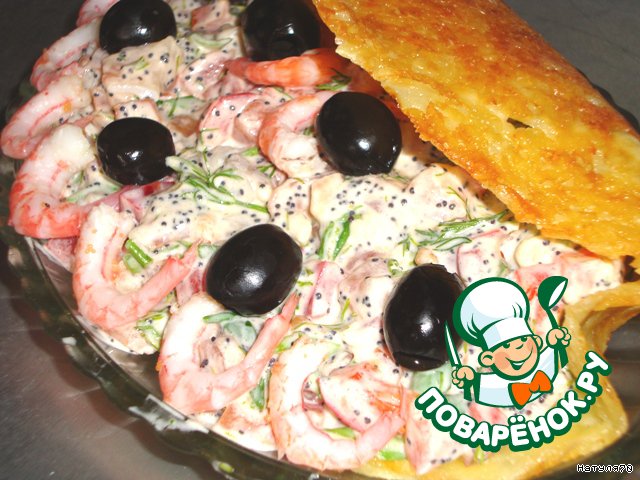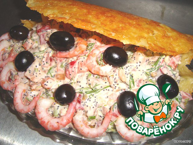 Сырную ракушку раскрыть, выложить салат, украсить очищенными креветками и маслинами.