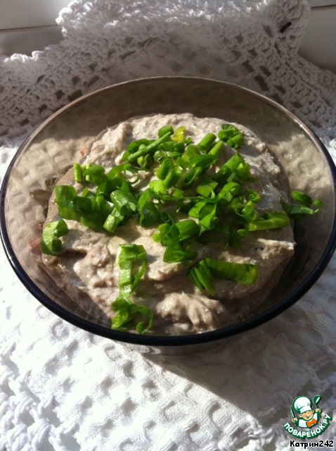 Добавить нарезаный шнитт-лук, молотый перец, по надобности соль или еще чуток лимонного сока – на Ваше усмотрение. Хорошенько взбить лопаткой, мусс станет воздушней. Выложить в порционные формочки или в одну большую и отправить в холодильник на 2 часа.