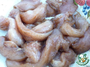Куриную грудку режем на полоски, добавляем соевый соус, аджику, соль, перец, хорошо перемешиваем и оставляем на время.