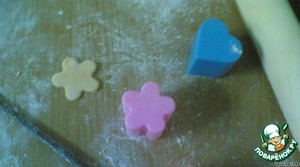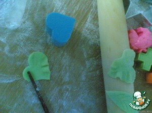 Раскатать мастику (ее надо раскатывать не очень тонко, не меньше 2 мм, иначе готовые цветочки при обмазывании могут сломаться). Берём формочки, у меня под рукой была только звездочка для печенья, дочин конструктор и немного сообразительности) и вырезаем фигурки! Начнем со звёздочки.