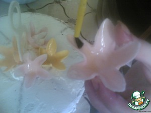Ну и перед тем, как украсить тортик, каждый цветочек и листик обмазываем джемом от варенья (желательно грушевого или яблочного, там джем прозрачный).