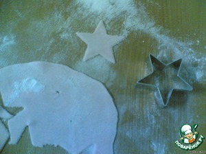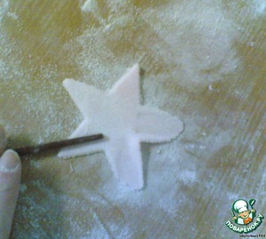 Насыпаем муку в чашку (примерно 3см.), пальцем делаем углубление, кладем туда нашу звездочку, и продавливаем чем ни будь, не слишком тонким, но округлым (я использовала детальку от конструктора).
