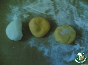 Готовую мастику делим на шарики и красим пищевыми красителями в разные цвета (эти цветочки не очень то кто и ест, поэтому я подкрашивала краской для яиц).