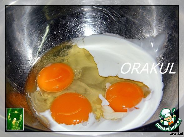 Ну, и сделаем заливку: три яйца, желток, что остался от теста,