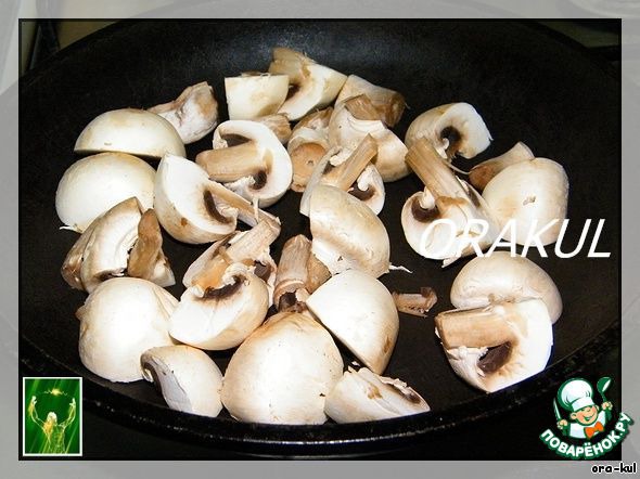 Грибы нарежем и обжарим на совершенно сухой сковороде, немного посолим и поперчим, отложим в сторону.