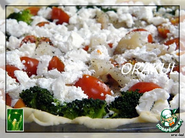 Теперь раскладываем на тесто начинку, да и пора включить духовку,