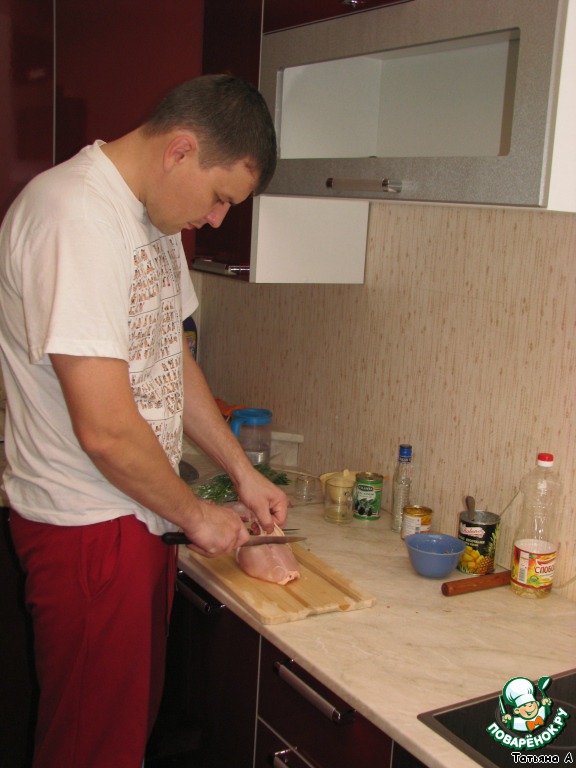 • Куриную грудинку хорошенько промыть и снять с нее кожицу. Нарезать небольшими кусочками чернослив и ананас.