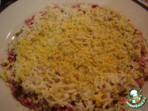 Украшем салат - присыпаем зеленью, укладываем ромашки, а в них замоченные в самом начале белки (порезали, добавили душистый перчик и чеснок, зелень, все перемешали).
