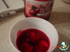 Трем белок и заливаем соком свеклы (нам понадобится для салата, свекла - из банки).