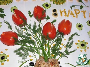 Это блюдо - настоящий подарок весны. Муж приготовил его к празднику 8 марта. И, как он объяснил: "моя фантазия выходит за границы тарелки", то он оформил ее в виде вот такой открытки к празднику. Было даже немного жалко есть такую красоту. Это был самый лучший подарок к 8 марта. Так что, мужчины, рекомендую!!! Этот рецет отлично подходит к конкурсу "Весна в сердце".