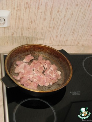 Свинину промыть, нарезать небольшими кусочками. Обжарить на растительном масле 20-25 мин., предварительно посолить и поперчить.