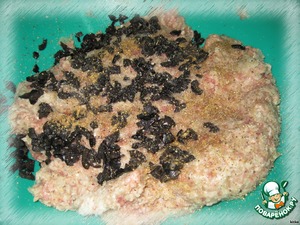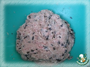 Говядину, свинину, лук и батон (предварительно замоченный в молоке) перекрутить на мясорубке. Добавить соль, специи и маслины.