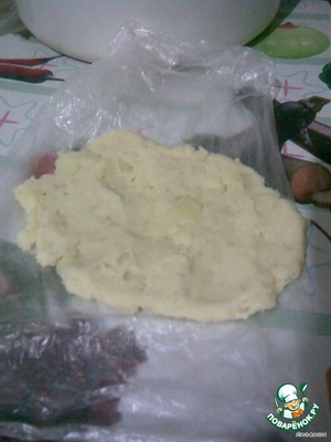 На целлофан ложкой выложить порцию пюре для лепешки, середину - потоньше, края - потолще