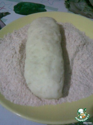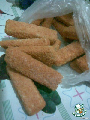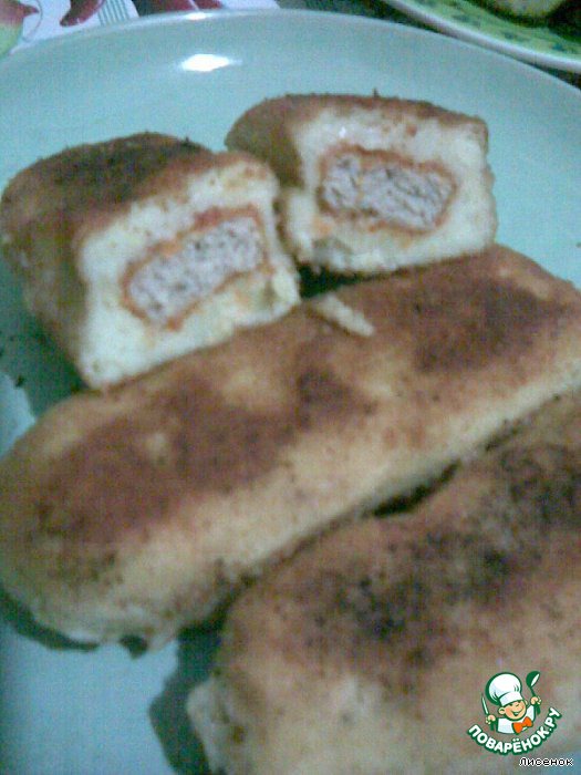 "Пирожок" обвалять в сухарях или муке. Обжарить на растительном масле с двух сторон. Подавать горячими, полить соусом (на ваш вкус). Мы ели с майонезом.