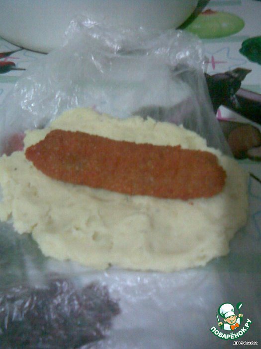 В середину положить рыбную палочку и слепить "пирожок". Можно свернуть, помогая целлофаном или руками, но руки смочить водой или мукой, чтобы "тесто" не прилипало