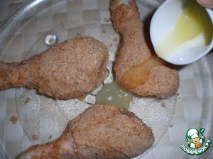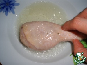 В другую посуду вылить яичный белок. Взять ножки, очистить их от лаврового листа и от чеснока и хорошо намочить в белке.