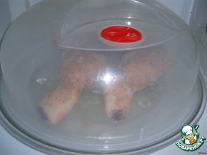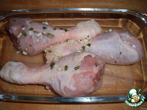 Очищенные от перьев и вымытые голени положить в посуду с лимонным соком, чесноком и измельчённым лавровым листом. Намочить хорошенько в этой смеси, накрыть и поставить в холодильник на час.