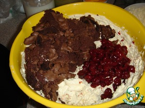 Пока коржи остывают, масло сбиваем со сгущенкой, добавляем вишню. Потом отщипываем почти половину из середины каждого коржа и добавим к маслу и вишням. Хорошо все перемешиваем и накладываем на каждый корж, соединяем (фото в разрезе).