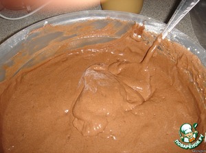 Сбиваем отдельно белки + 1 ст. сахара и желтки + 1 ст. сахара. В желтки в самом конце всыпать какао и еще 3 мин взбить. Аккуратно смешиваем ложкой белок с желтком, добавляем соду и муку. -