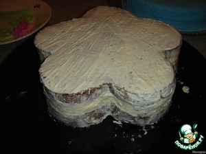 Сверху смазываем маслом со сгущенкой, (заранее откинули 100 гр. без вишни) и ставим в холод, пока будут готовиться украшения из мастики.
