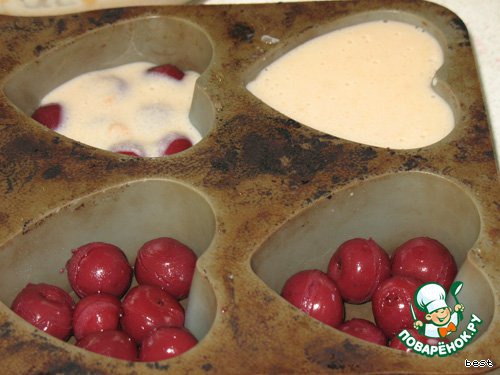 Сполоснуть формочки холодной водой (у меня были силиконовые формочки, так что ничего не делала). Вниз выложить вишню, сверху залить пудингом и поставить в холодильник.