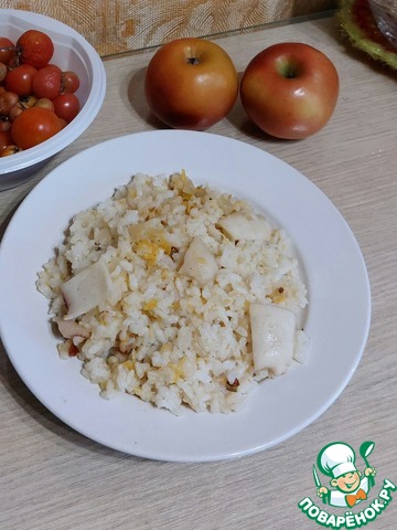 В котелке (или в другой посуде, в которой будете тушить блюдо) смешать рис, обжаренные овощи и кальмара. Добавить специи и приправы. Залить водой, чтобы чуть покрыть рис. Примерно 200 мл воды на данное количество продуктов. У меня на фото еще без добавления воды. Накройте крышкой и тушите в предварительно разогретой духовке при средней температуре до готовности риса. У меня это заняло 20 минут.