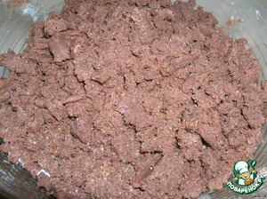 250г масла порубить ножом, растереть с 0,5 ст. сахара, мукой и какао в крошку.