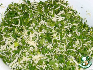 Нарезаем мелко зелень, натираем сыр на мелкой терке. Все посолить, поперчить.