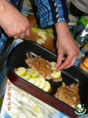 Яблоки порезать ломтиками. На куски свинины выложить лук, на лук-дольки яблок. Яблоки слегка посыпать коричневым сахаром и корицей.