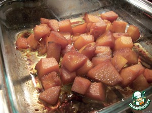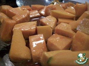 Тыкву нарежем на кубики средней величины и замаринуем в смеси из 1 ст.л. соевого соуса и 2 ст.л. растительного (я брала оливковое) масла. Оставим на 10 минут. Затем поместим в разогретую духовку на 160 градусов минут на 20-30 до готовности.