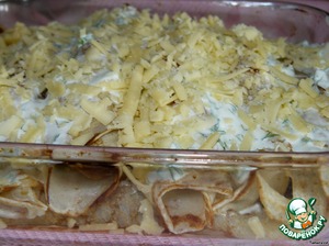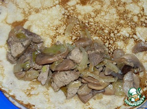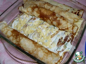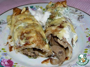 Рецепт «Блинчики фаршированные грибами, куриной печенью под сливками и сырной корочкой»: