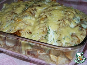Блинчики фаршированные грибами, куриной печенью под сливками и сырной корочкой