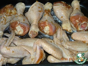 Ножки и крылышки вынуть из маринада, дать стечь, переложить в форму для запекания, смазанную растительным маслом и поставить в разогретую до 180 градусов духовку на 30-40 минут.