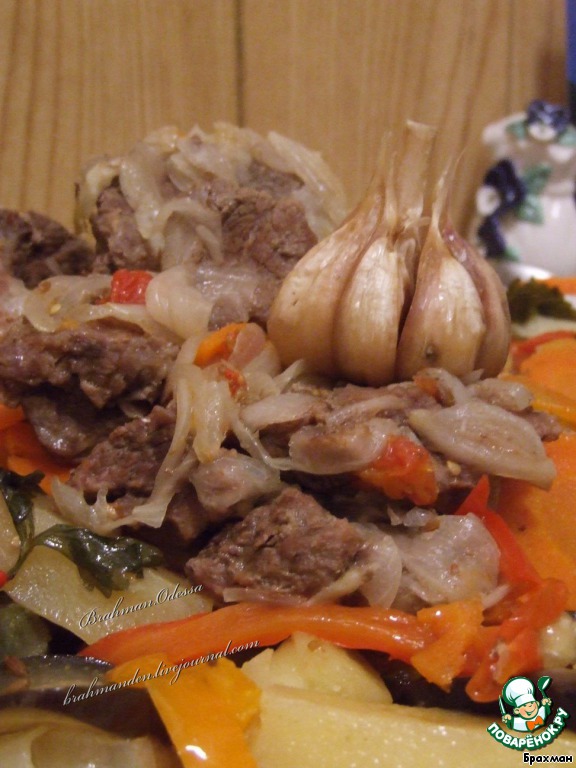 предварительно еще читала книгу Сталика и смотрела видео на ютюбе, из ингредиентов уложила обязательные + перец болгарский, баклажан, цветная капуста и немного грибов на мясо с луком (белый и маслята). В след. раз попробую без перца, или меньше, так как показалось, что доминирует его вкус. Гости обзывали басму овощным рагу, негодники))