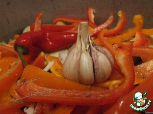 Сверху снова присаливаем, присыпаем зирой и укладываем чеснок. Предварительно раздев его от верхней кожуры. Чили кладем просто рядышком. -