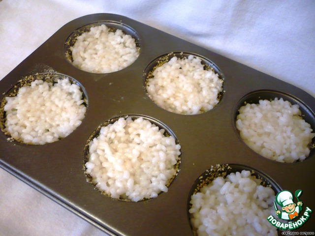 Кладем десертную ложку зеленого риса. Немножко утрамбуем (чуть-чуть).