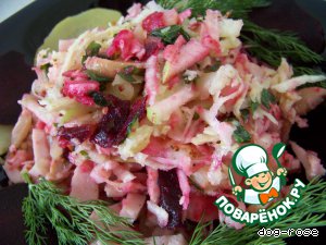 В журнале рекомендовалось далее выложить салат на блюдо, украсить кусочками вареного картофеля, свеклы, зеленью петрушки (я брала укроп). Все, салатик готов. Приятного аппетита!