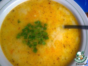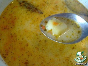 В кастрюлю с картофелем положить спассерованные овощи, сыр, всыпать тонкой струйкой манную крупу, положить лавровый лист, посолить, поперчить (я еще добавляю универсальную приправу) и перемешать. Дать супу прокипеть 5-7 минут, затем снять с огня и оставить на 5 минут настояться.