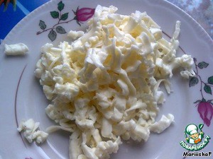 Плавленый сыр натереть на крупной терке. Обычно перед тем как воспользоваться плавленым сырком, я кладу его в морзильник, чтобы легче было натереть его на терке.