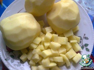 Воду довести до кипения. Картофель очистить, нарезать кубиками и варить до готовности.