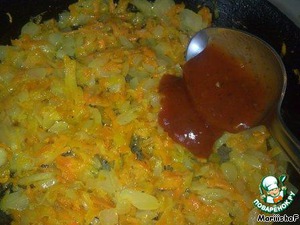 Затем добавить в сковороду с овощами томатную пасту (у меня томатной пасты не оказалось и я добавила кетчуп "шашлычный"), перемешать и еще пассеровать 3 минуты.