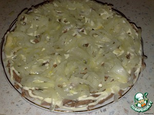 Теперь маринуем лук. Я делаю так: нарезаю его полукольцами, вливаю уксус, сыплю сахар (по 1-2 стол. ложки, но пропорции приблизительные, пробуйте по вкусу), перемешиваю. Заливаю холодной водой (чтобы лук не полностью покрывала), оставляю на минут 10-15. Выкладываем вторым слоем, поливаем майонезом.